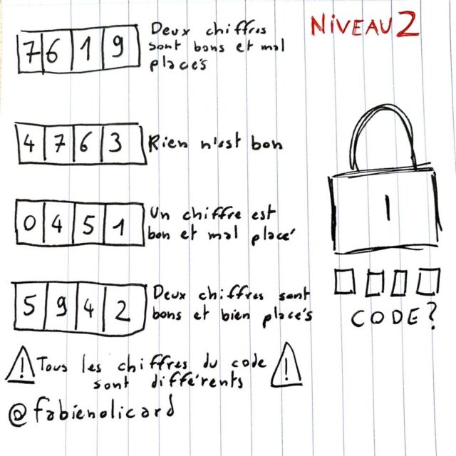 7619 : Deux chiffres sont bons et mal placés 4763 : Rien n’est bon 0451 : Un chiffre est bon et mal placé 5942 : Deux chiffres sont bons et bien placés Tous les chiffres du code sont différents.