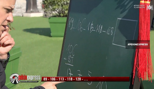 Suite logique 89, 106, 113, 118, 128 (énigme Pekin Express)
